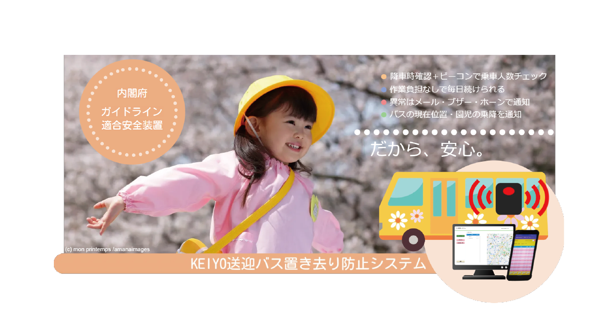 株式会社慶洋エンジニアリング様より、昨今問題になっている園児のバス置き去り問題を防止する「KEIYO送迎バス置き去り防止システム」が3月25日(土)から順次発売されます。